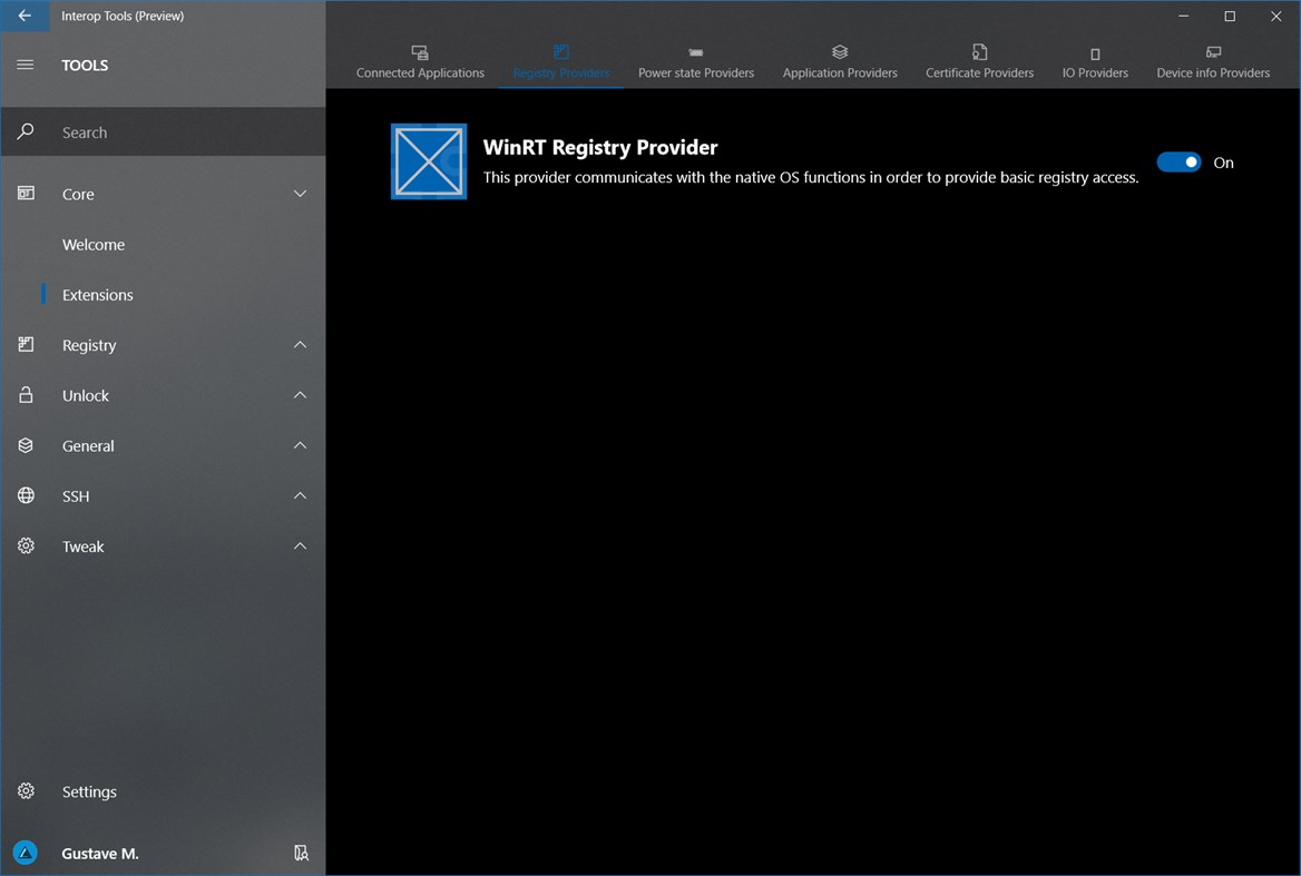 Interop Tools is an app that allows you to access multiple technical parts of your device. Through additional provider extensions (not included with the app by default), Interop Tools allows you to view and edit things such as Device Registry, Certificates, Applications, Device Info details and much more. Interop Tools will also allow other apps to access this app feature via App Services, it will include a built in permission system to allow the user to take control of which app has access to specific features. Interop Tools without any provider can also serve as a remote tool for another Interop Tools instance on another device, via Project Rome (in a future release) or the Remote Access functionality.