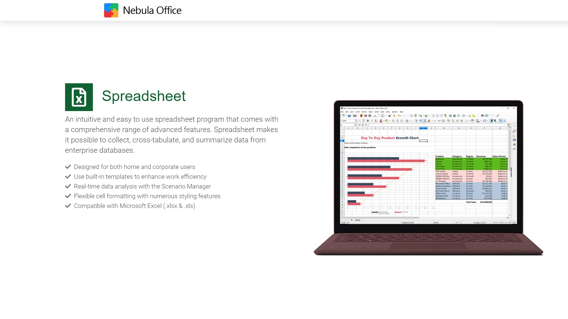 Nebula Office presents a suite of office productivity software for Windows users. It is compatible with Microsoft Office, Google Docs, Google Sheets, Google Slides and the entire collection of OpenOffice formats for Windows. It also includes a light PDF editor, a vector graphics and flowcharts drawing program, a databases editor, and a math formula software. Nebula Office is the perfect alternative to Word, Excel & PowerPoint for all levels of users.