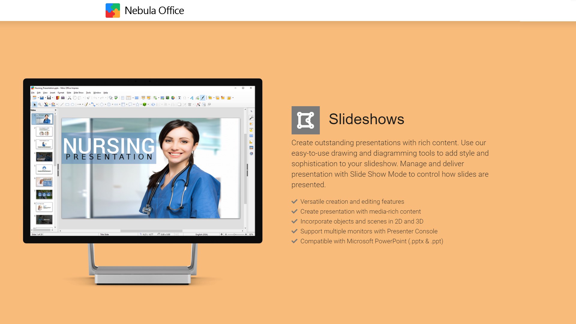 In addition to OpenDocument formats (.odp, .otp, and .odg), Nebula Office Slideshow can save in these formats: